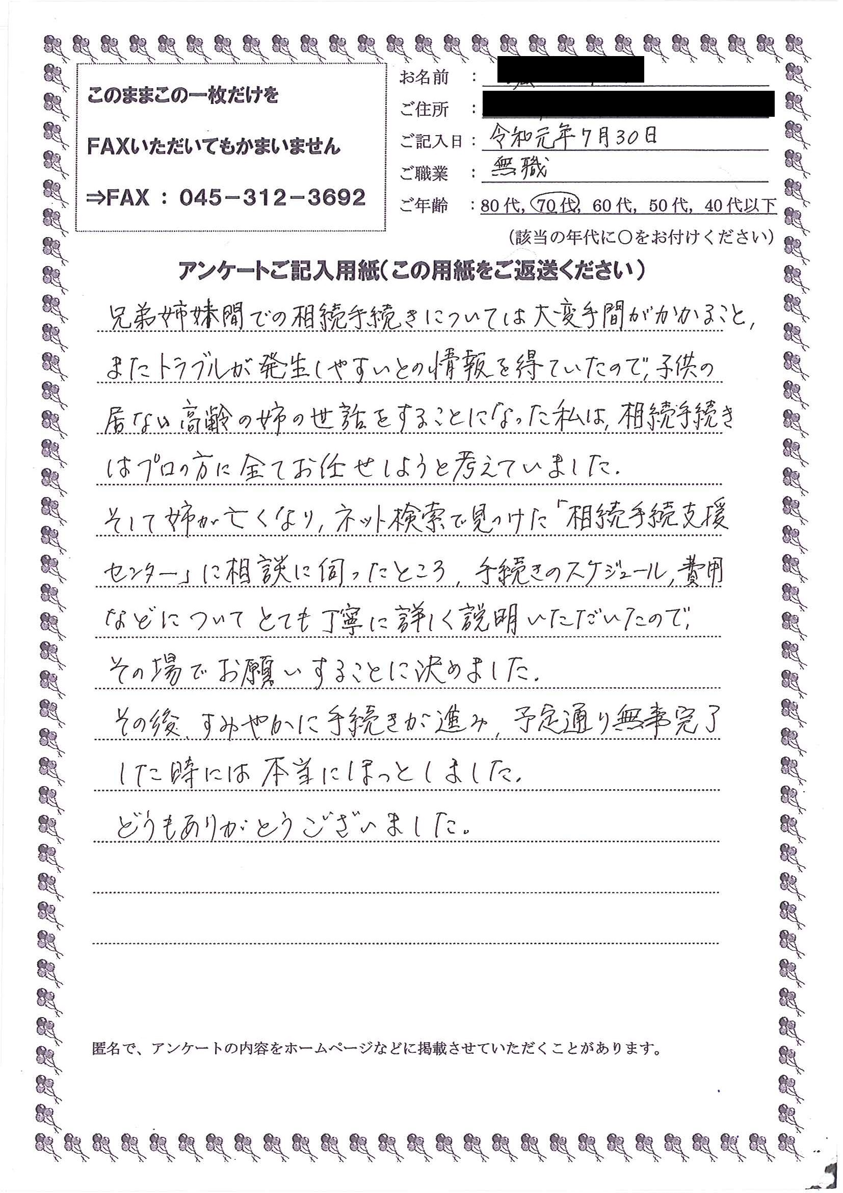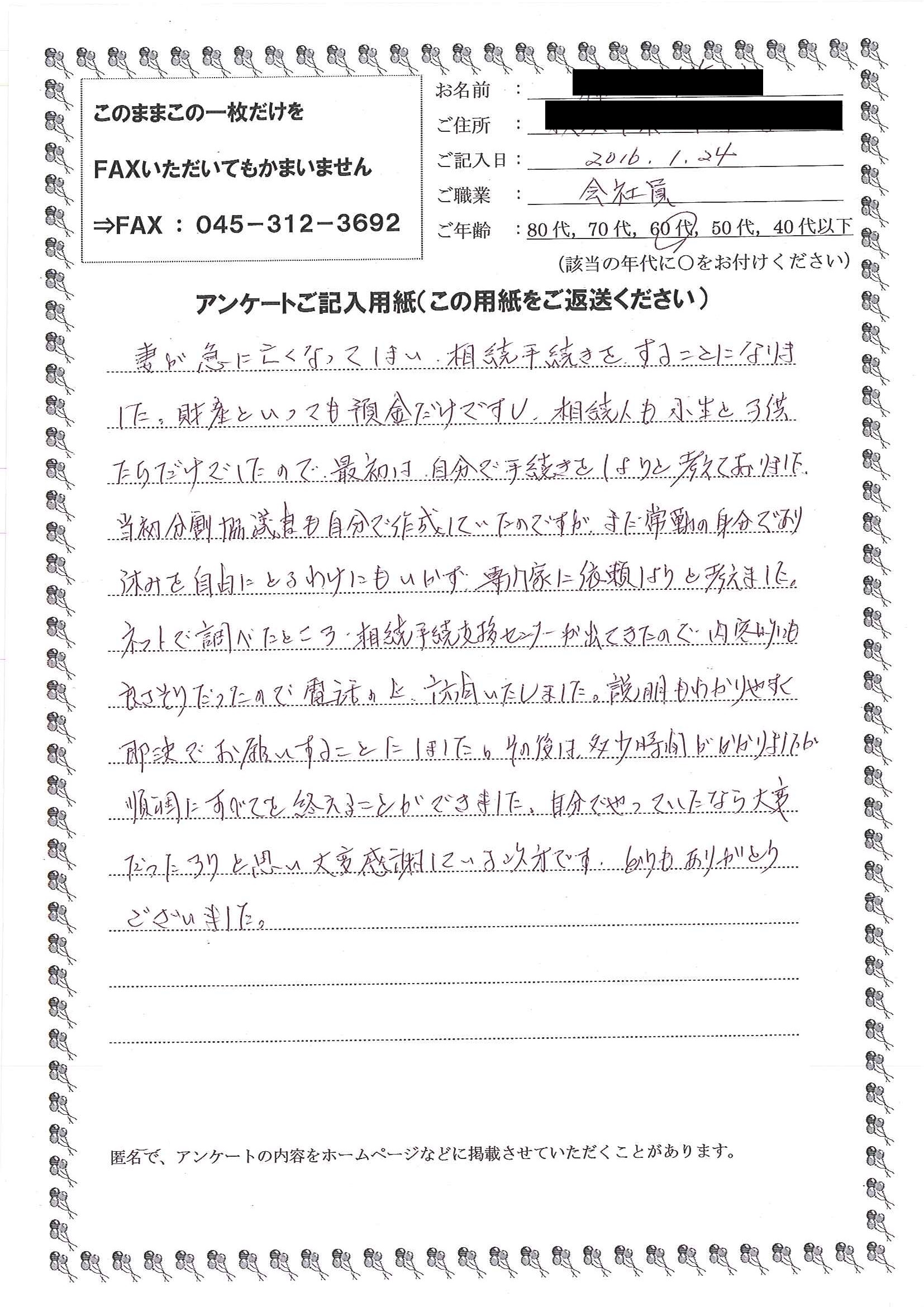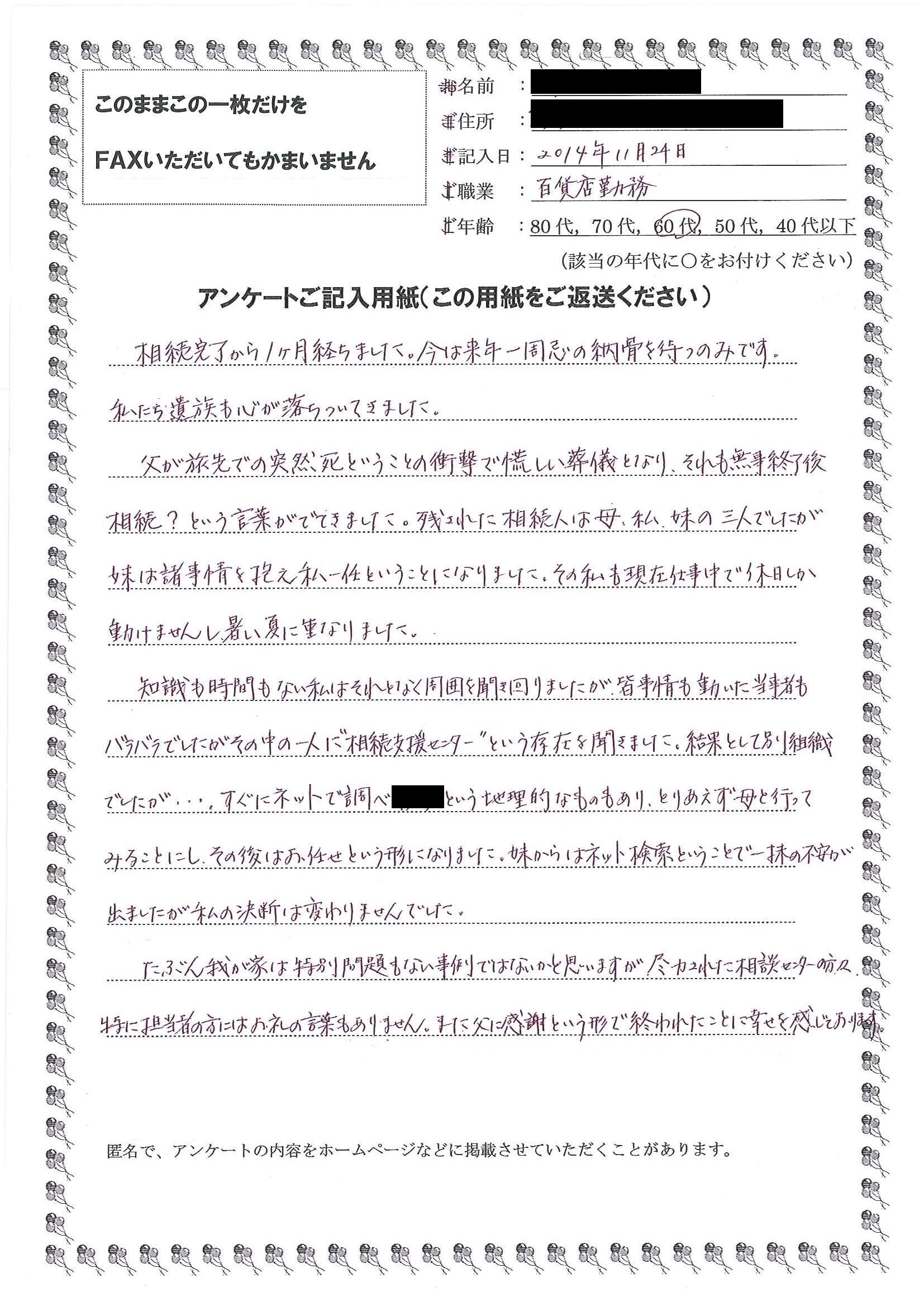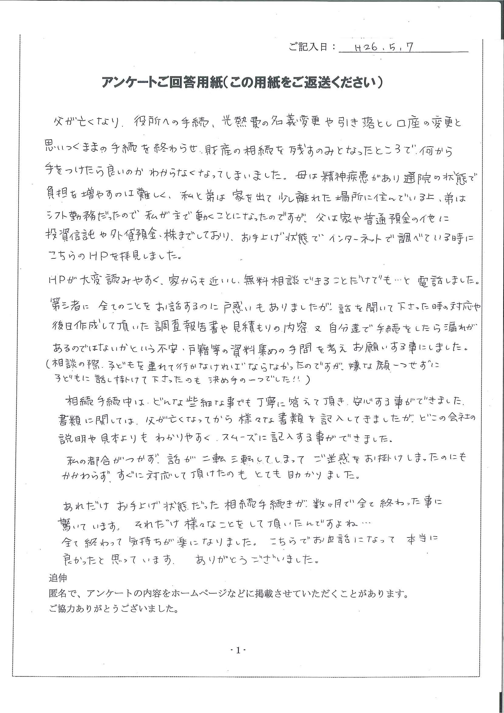 あれだけお手上げ状態だった相続手続きが数か月で全て終わった事に驚いています。