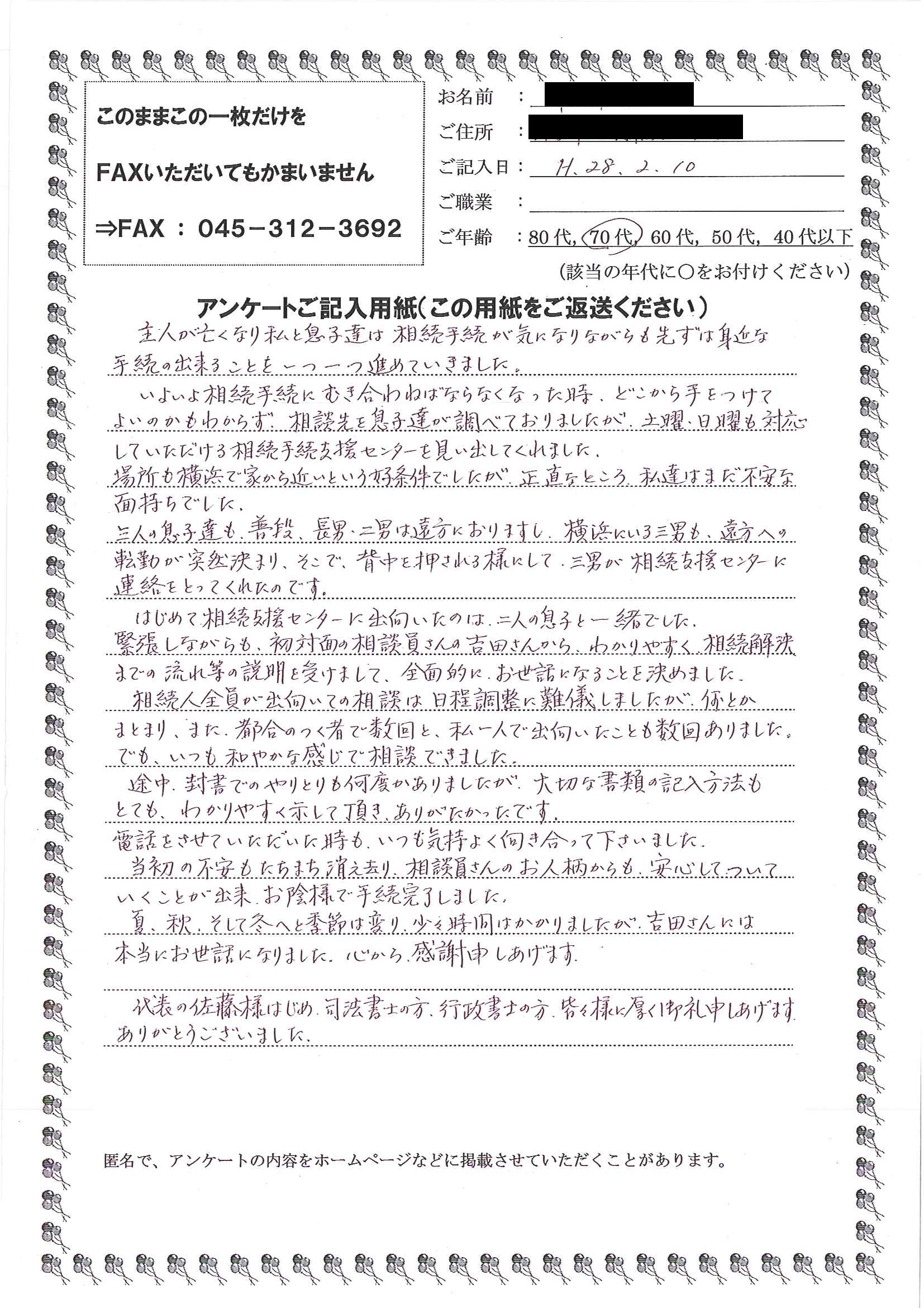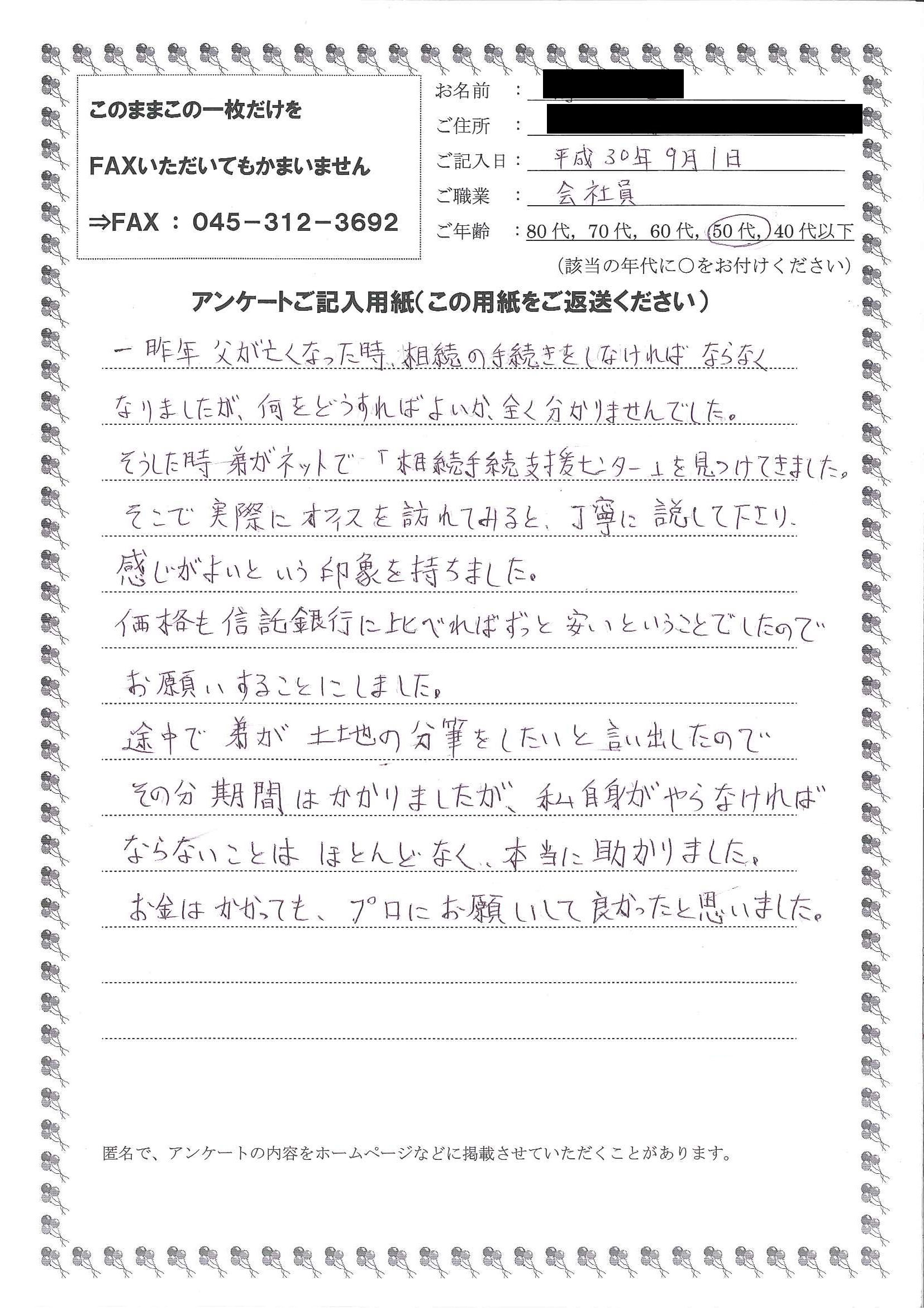 相続手続中はどんな些細な事でも丁寧に答えて頂き安心する事ができました。