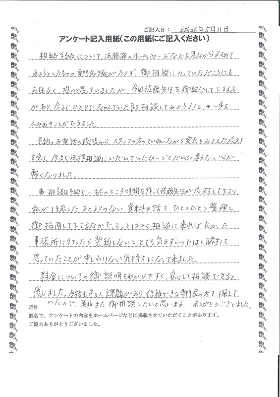 今まで法律相談にいだいていたイメージとだいぶ違うなと心が軽くなりました。