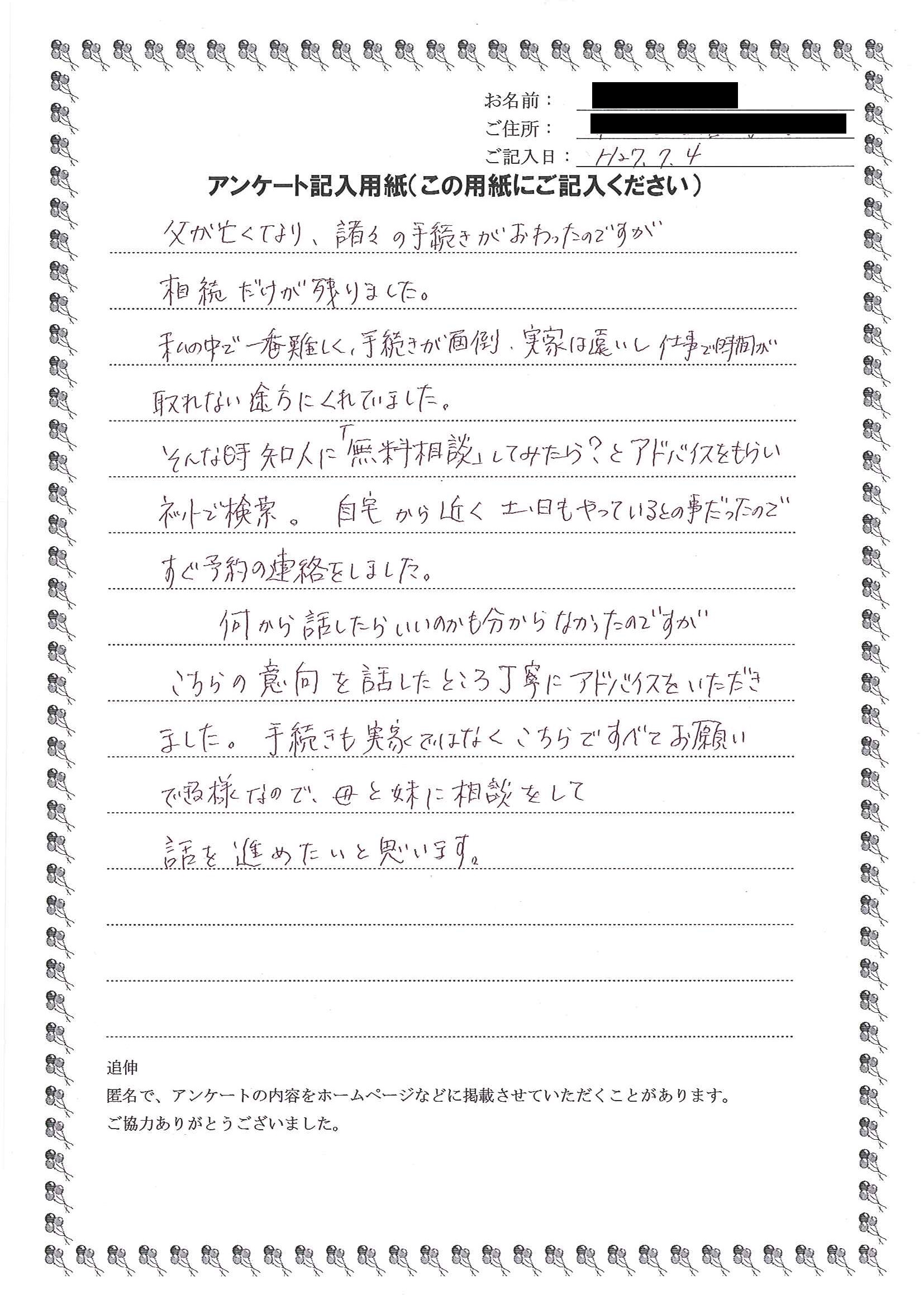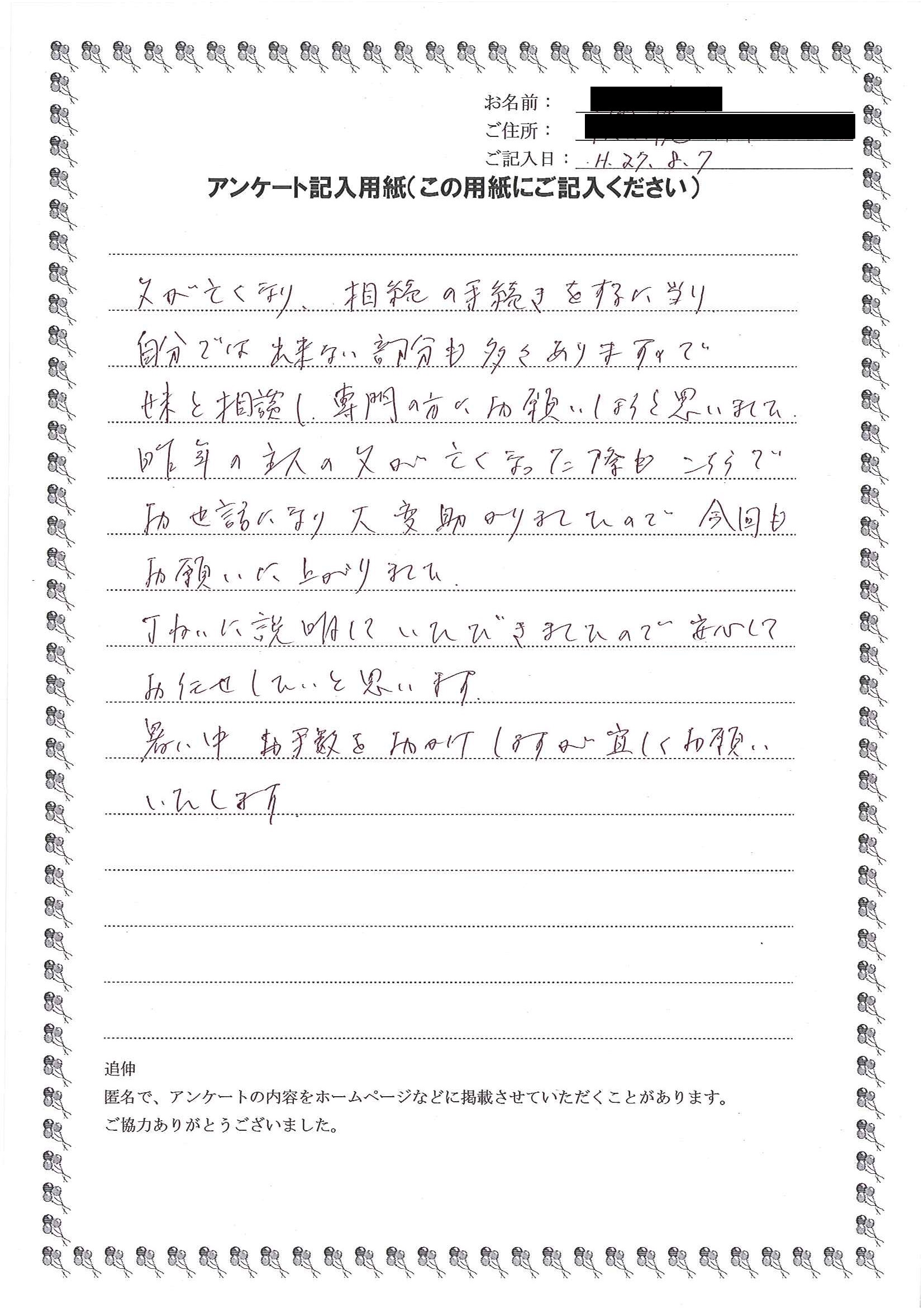具体的な相続に向けた流れを説明して下さったので、とても参考になりました。