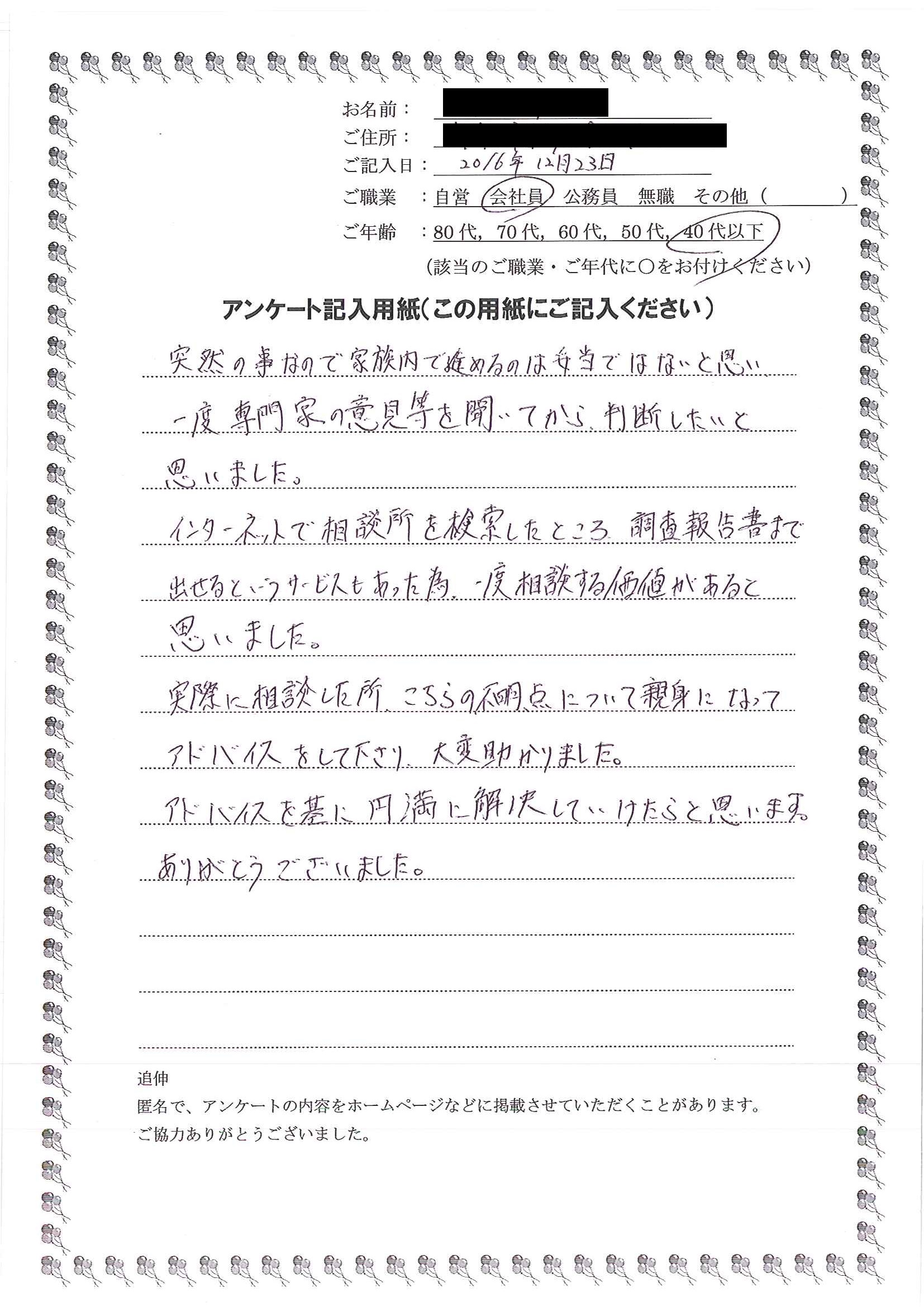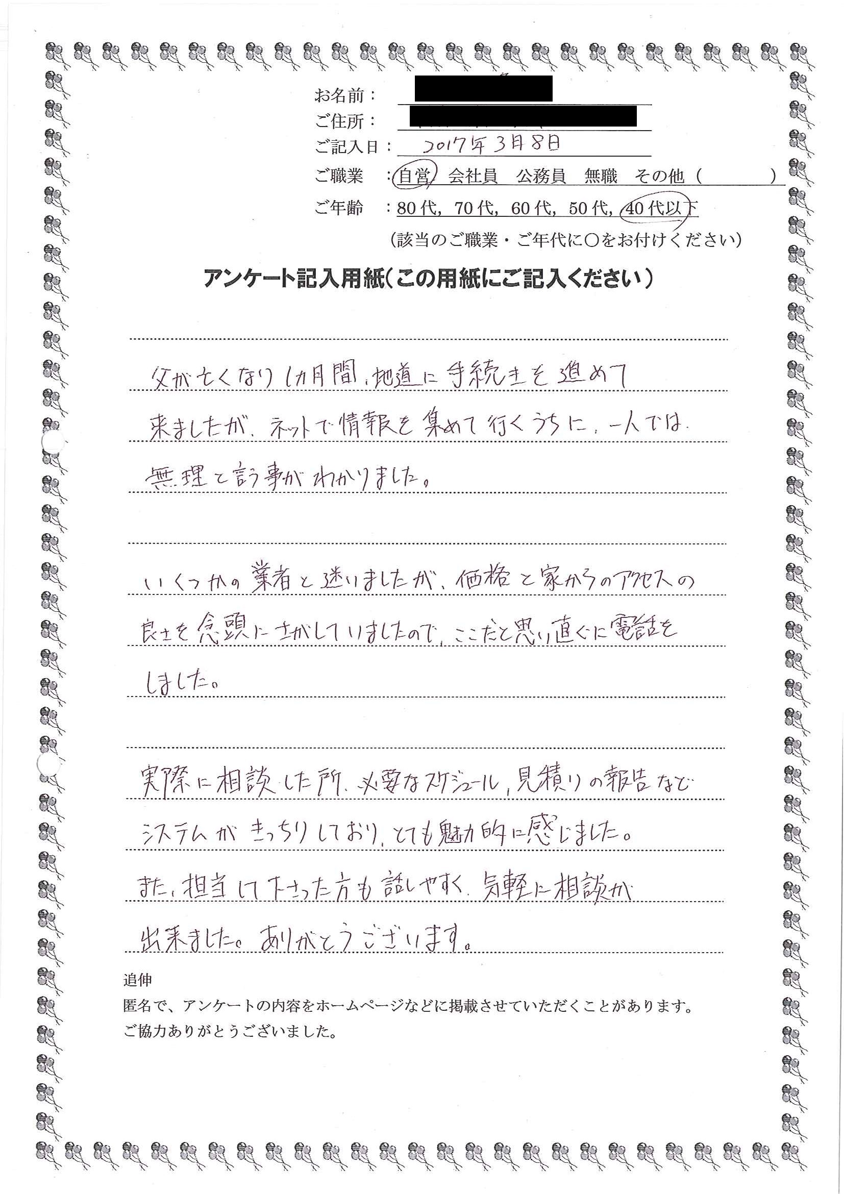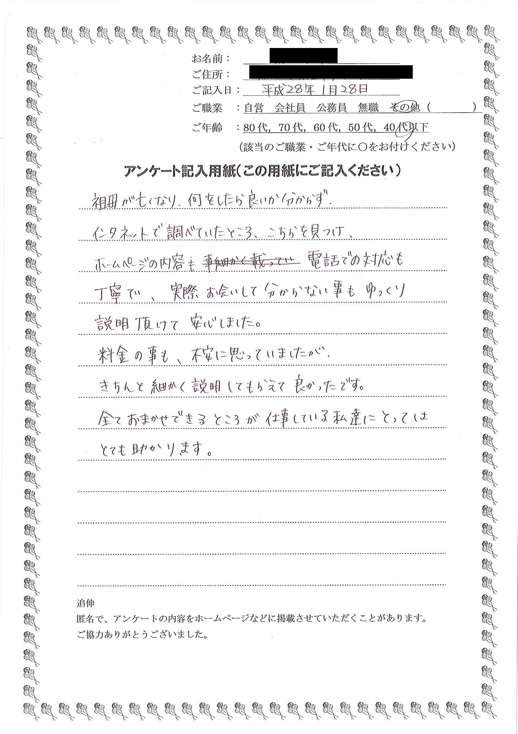 ホームページのお客様の声を読み、安心してお願いできると思いました。