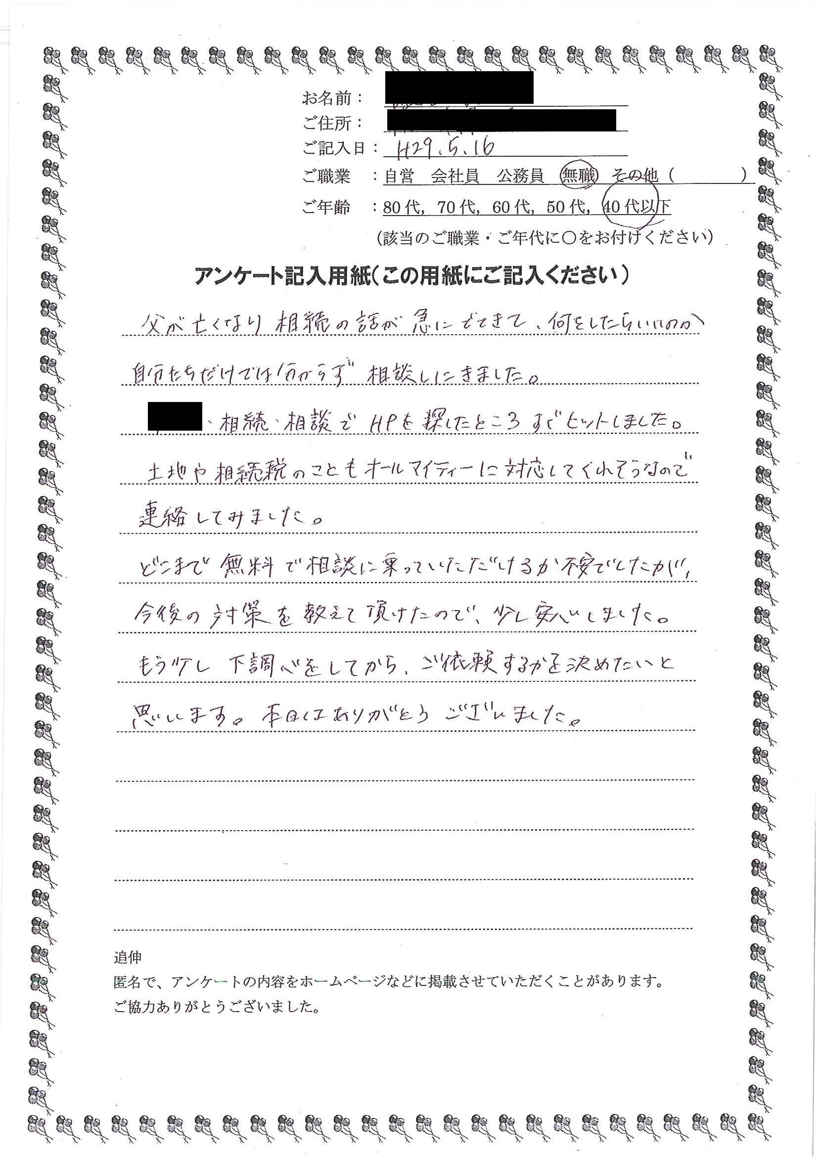 丁寧に返答していただき、安心して相続手続きをお願いできそうで