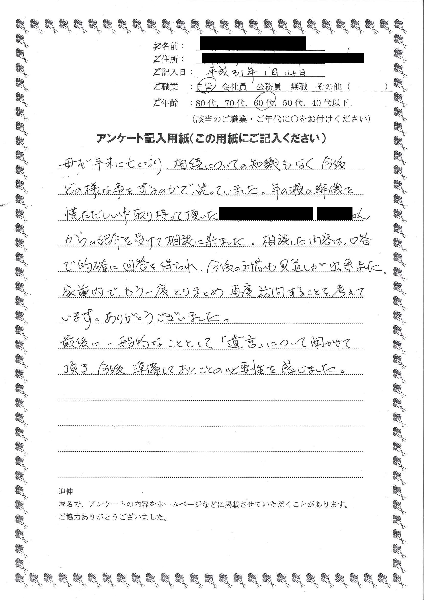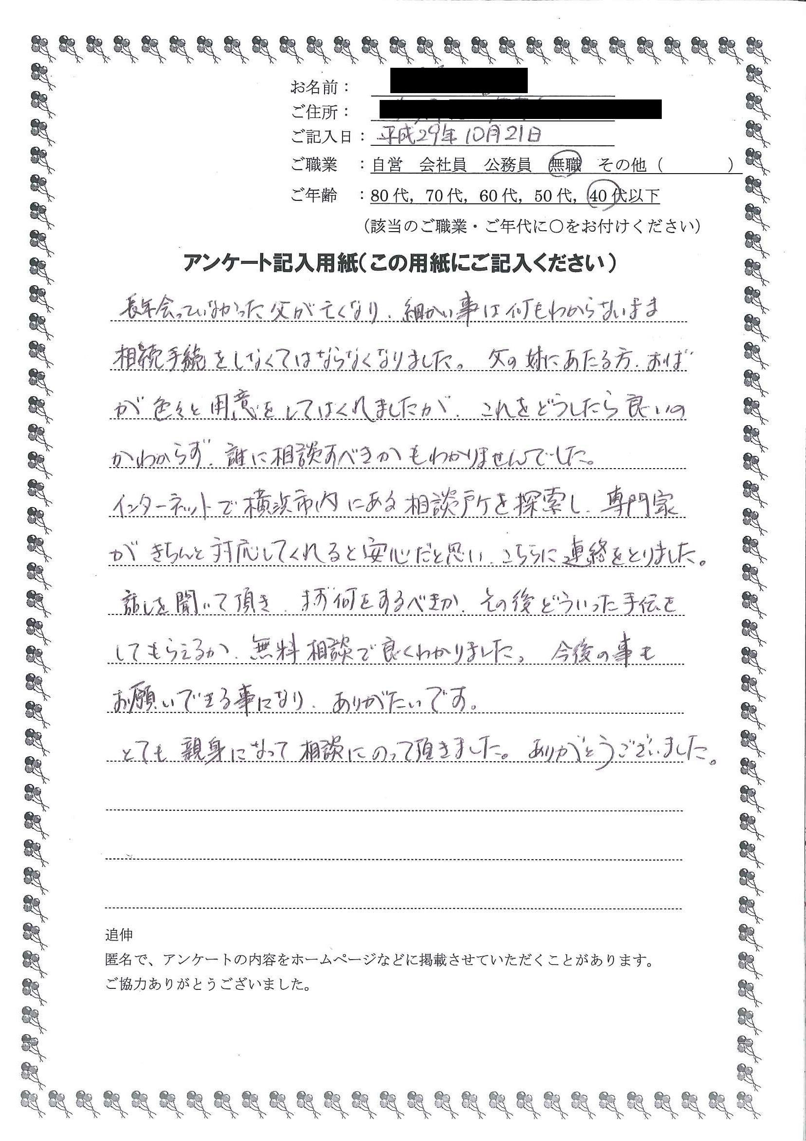 一般的な相続の話から、私達の案件での質問にも丁寧に答えていただき、