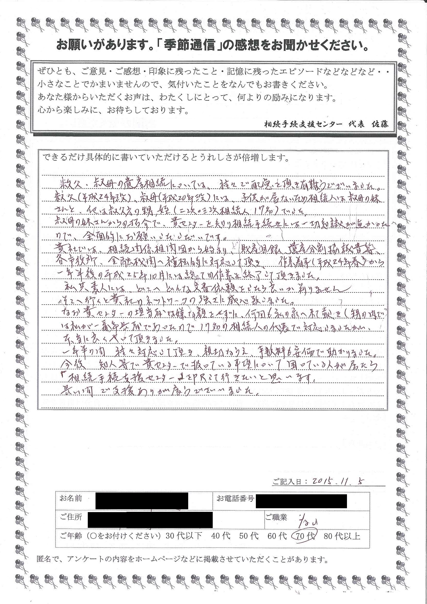 17名の相続人の代表で対応しましたが、本当に良くやって頂きました。